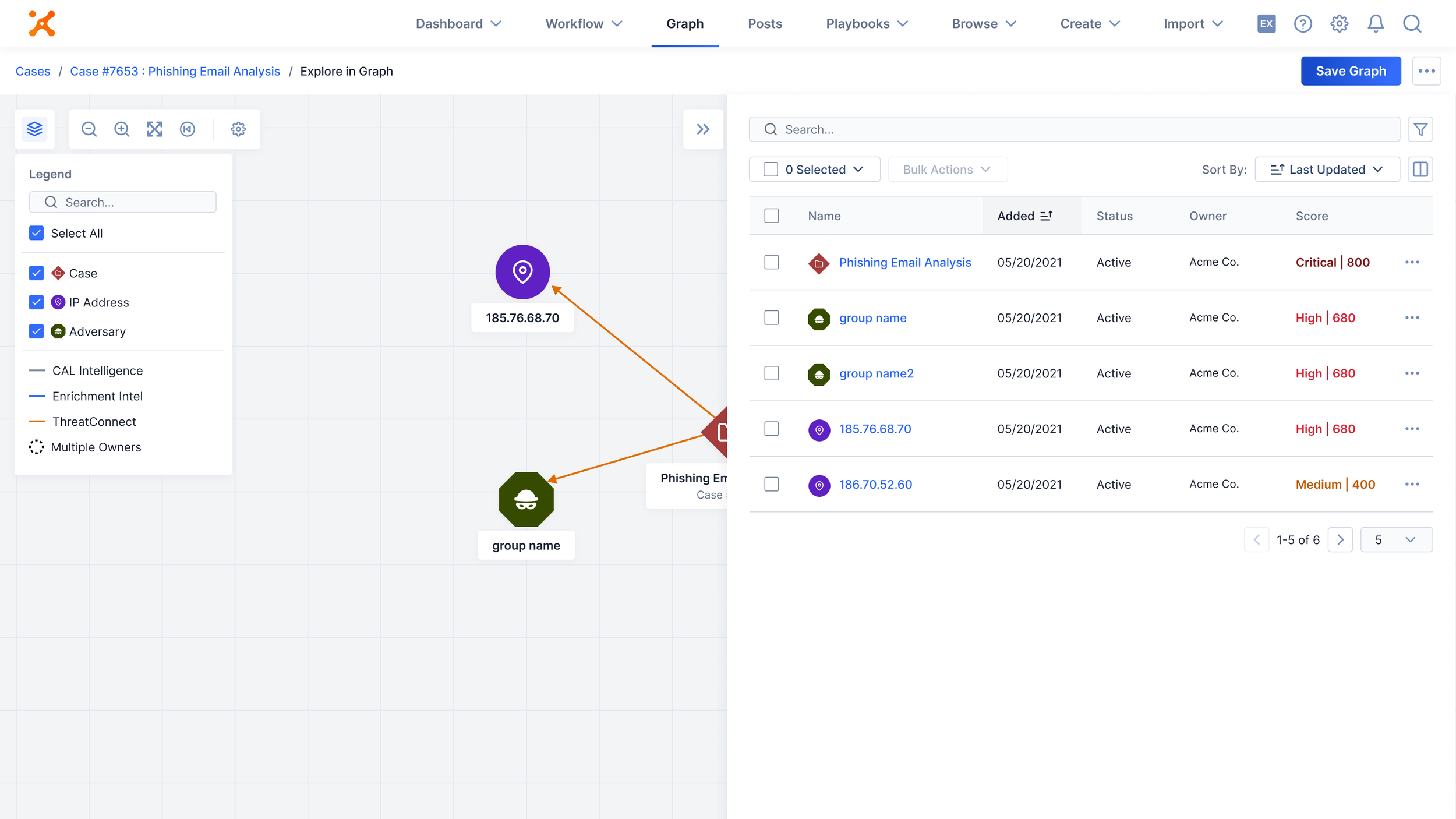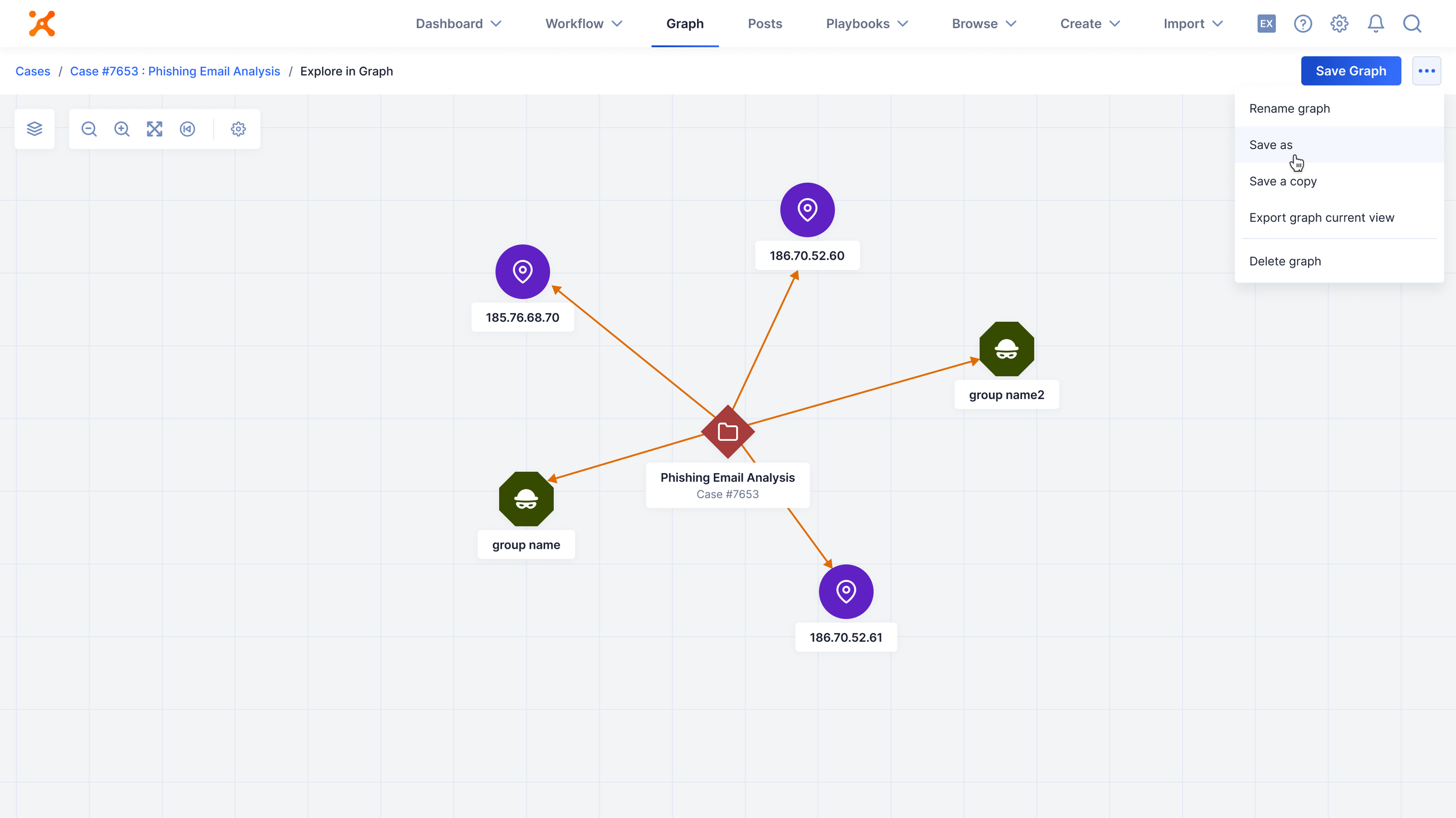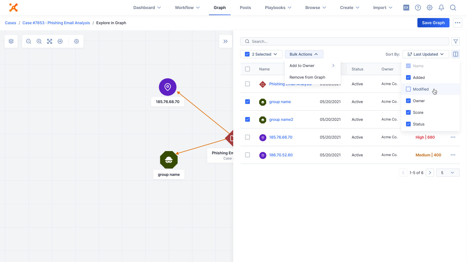 Bulk action capabilities enabling users to create cases, run playbooks, or assign owners directly from graph selections