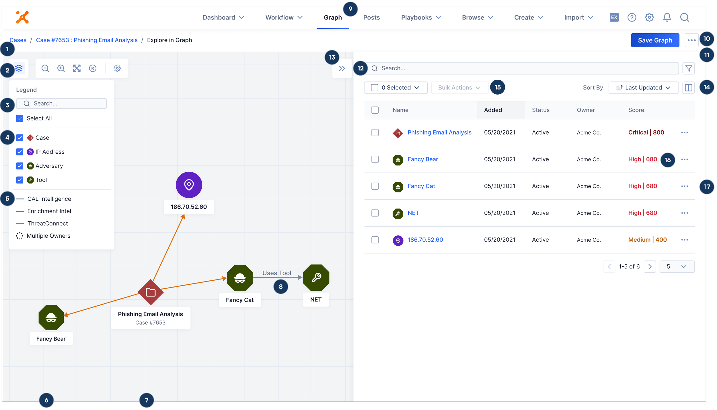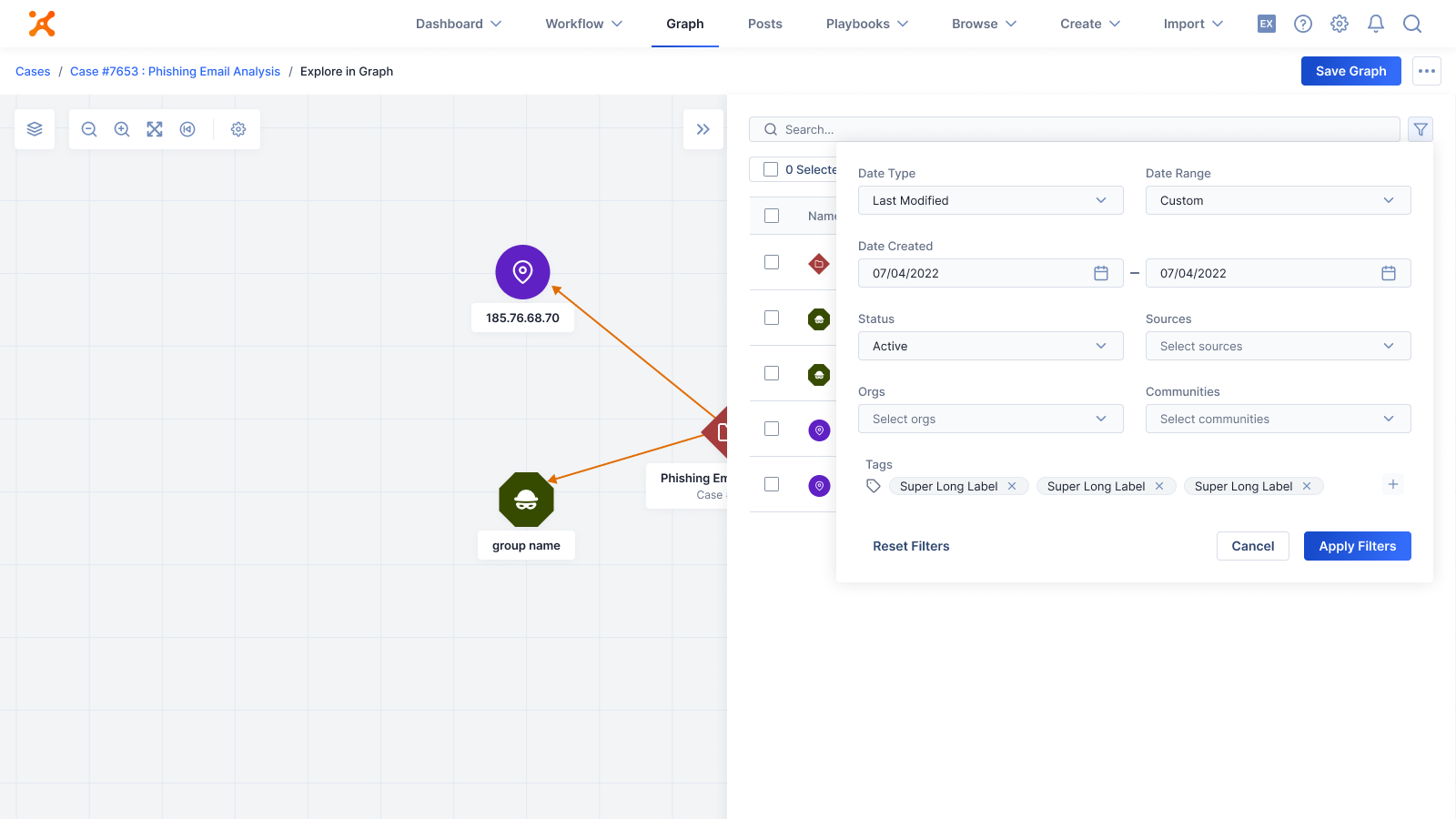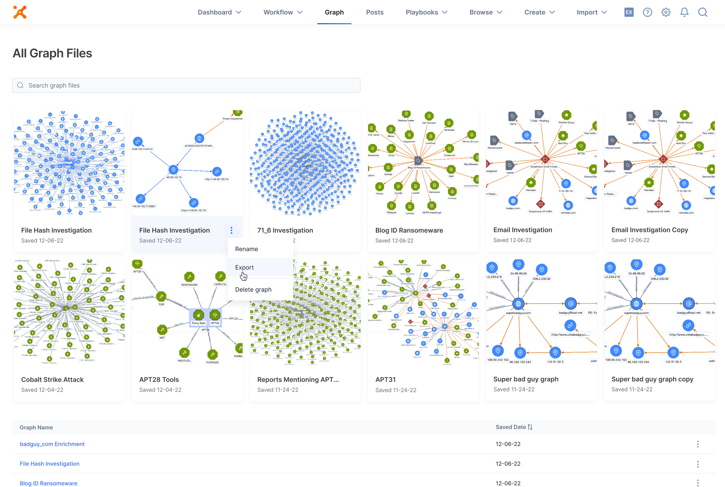 Bulk action capabilities enabling users to create cases, run playbooks, or assign owners directly from graph selections