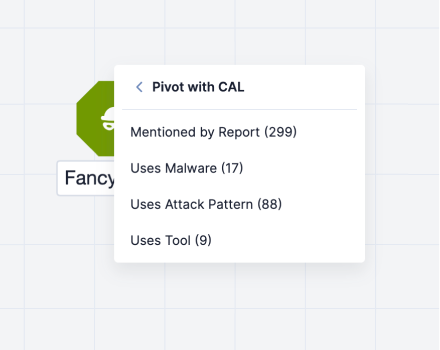 Example of the pivot pattern using CAL AI Data in the graph. Displayed is the node count for each pivot so analysts can determine the number of results returned before pivoting.
